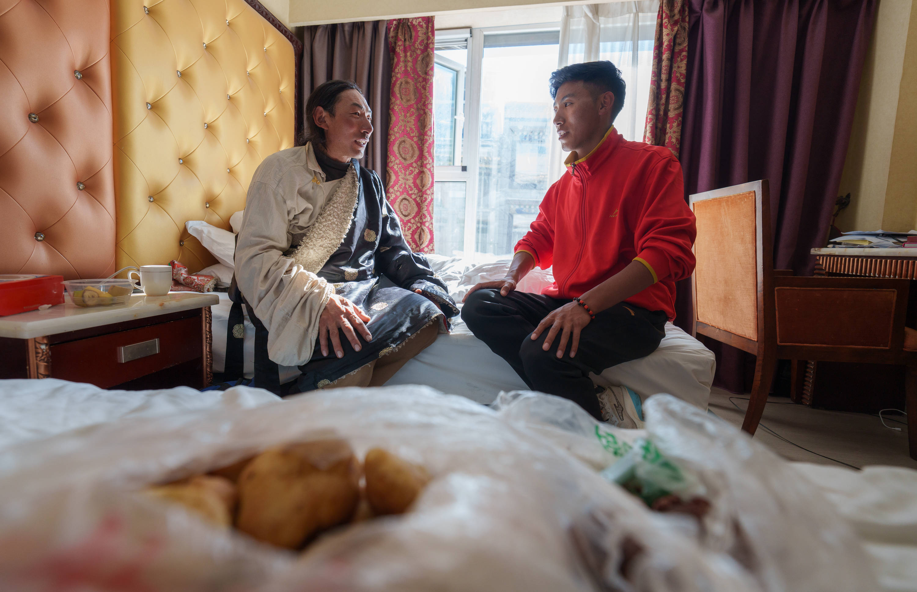 12月5日,索南加参(右)在拉萨的酒店房间中和父亲次仁多杰聊天。新华社记者 丁增尼达 摄在广东中山,羌塘的孩子索南加参醉氧了,“总感觉睡不醒”。但只要他站上赛场,昏昏沉沉的感觉就会一扫而空。