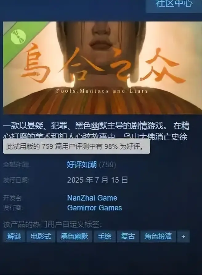 制作人玩什么游戏是他的自由开发者个人喜好 ≠ 游戏立场不应该让一个还没发售的作品“为别人玩什么买单”其实在争议出现之前,《乌合之众》口碑非常稳。7 月 15 日试玩版上线后,超700条评价里,好评率高达 98%。